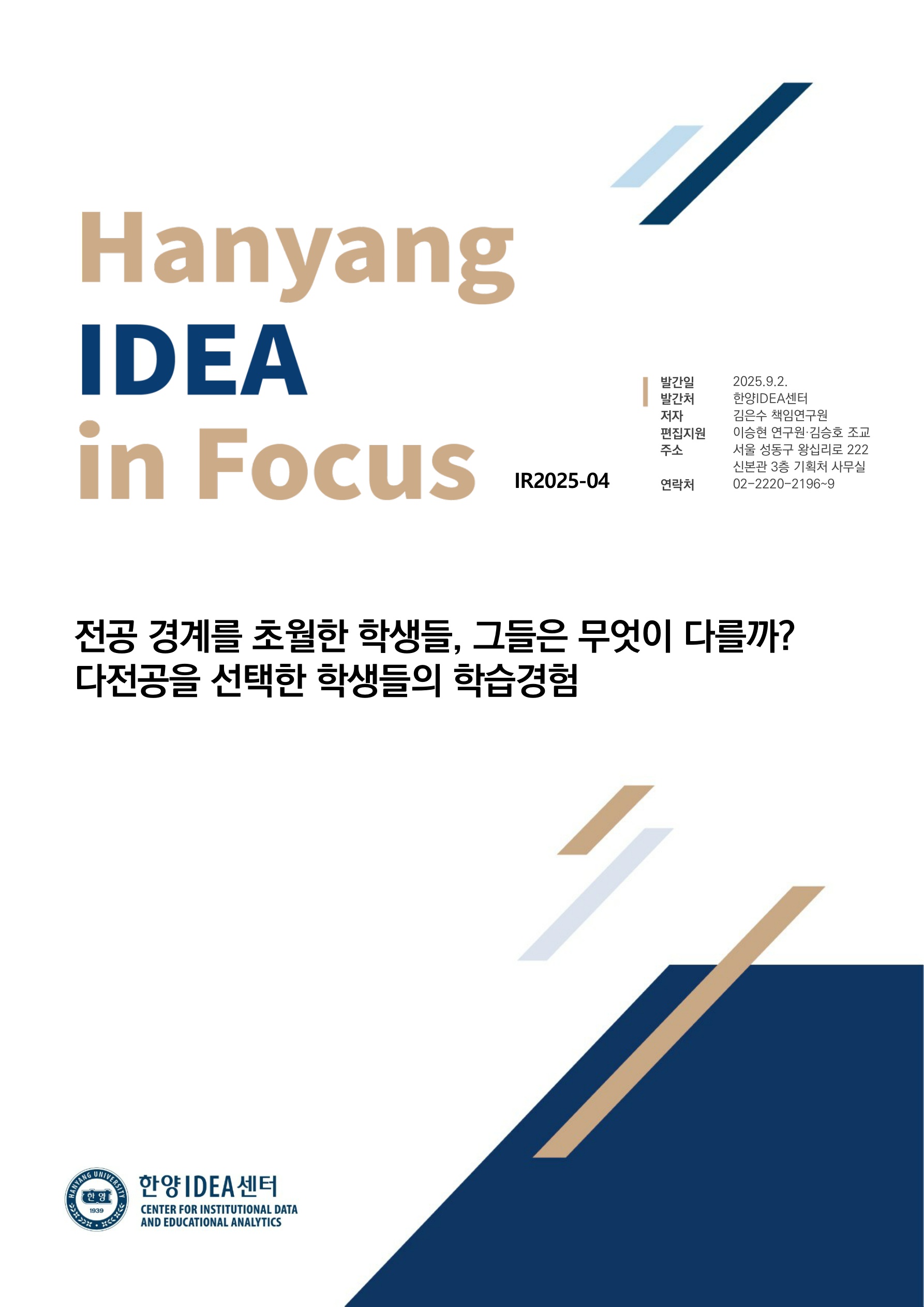 Cite this publication: 김은수. (2025. 9. 2.) 전공 경계를 초월한 학생들, 그들은 무엇이 다를까? 다전공을 선택한 학생들의 학습경험 (IR2025-04). 한양대학교, 한양IDEA센터.