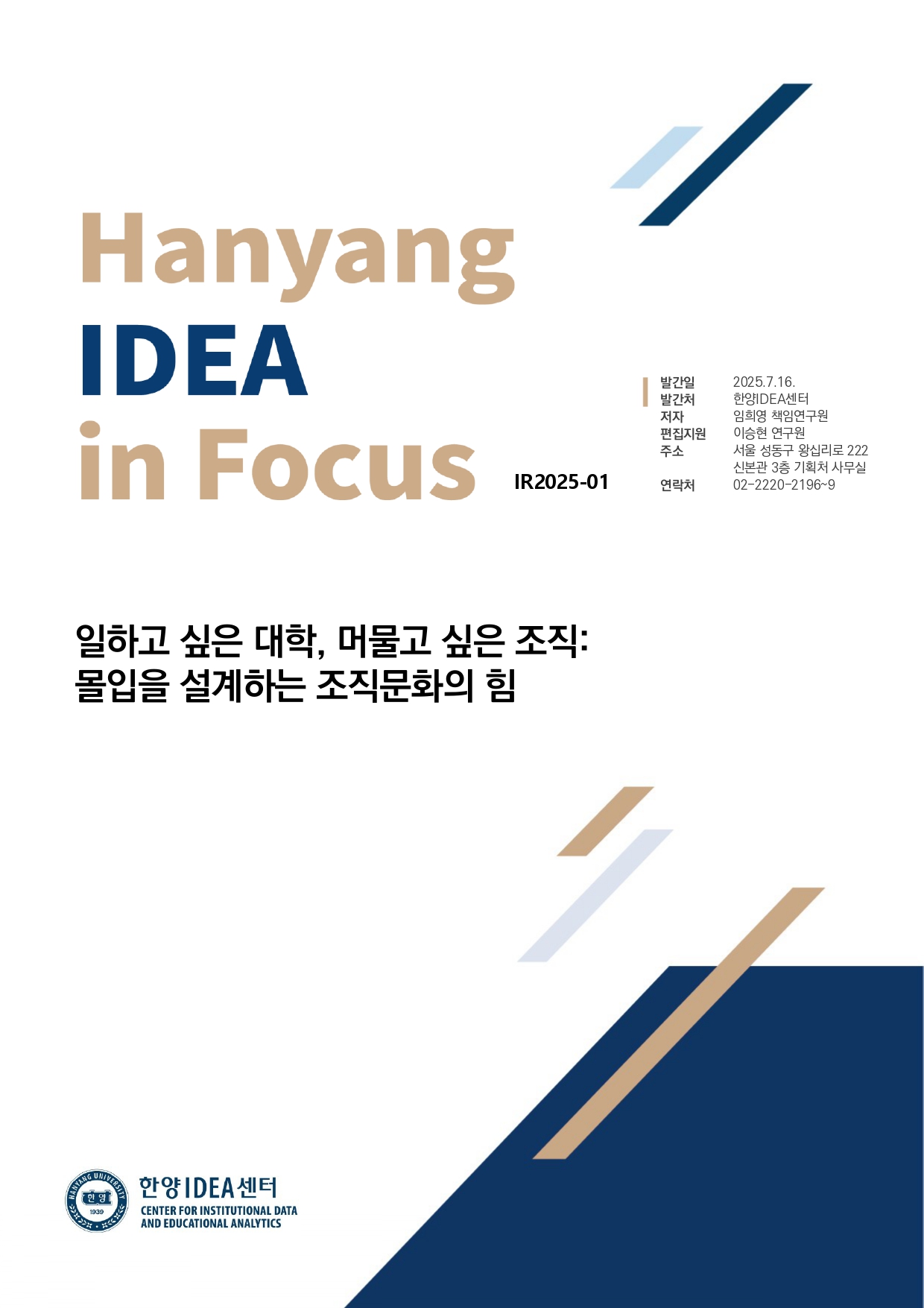 이번 콜로키움에서는 총 2개 연구발표와 이에 대한 질의응답 및 토론이 진행되었습니다: ① 일하고 싶은 대학, 머물고 싶은 조직: 몰입을 설계하는 조직문화의 힘 (임희영 / 한양IDEA센터 책임연구원); ② 전공 경계를 초월한 학생들, 그들은 무엇이 다를까? (김은수 / 한양IDEA센터 책임연구원). 다음 Hanyang IDEA Colloquium은 9월 중 온·오프라인으로 개최 예정이오니 많은 관심과 참여를 부탁드립니다.